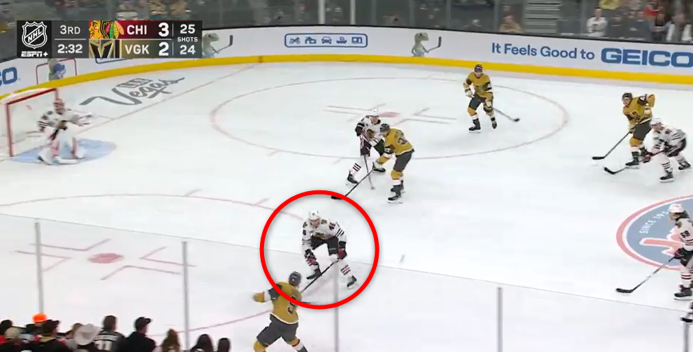 The third period saw some more sloppiness in the Hawks' zone. Chicago only had a 37.14% Corsi and a 34.27% expected goals share. Connor Bedard gifted the Hawks with a beautiful goal that made the ESPN broadcast moister than an oyster. Unfortunately, the Golden Knights took advantage of some horrid defensive positioning by Louis Crevier. Here’s a screenshot of Crevier way out of the dot lane. Yes. This is a hybrid defensive zone coverage, but that doesn’t change the basic fundamentals of defending a three-on-two. If you’re going out that far, at least get a stick in the passing lane and leave the low percentage shot to Spencer Knight.