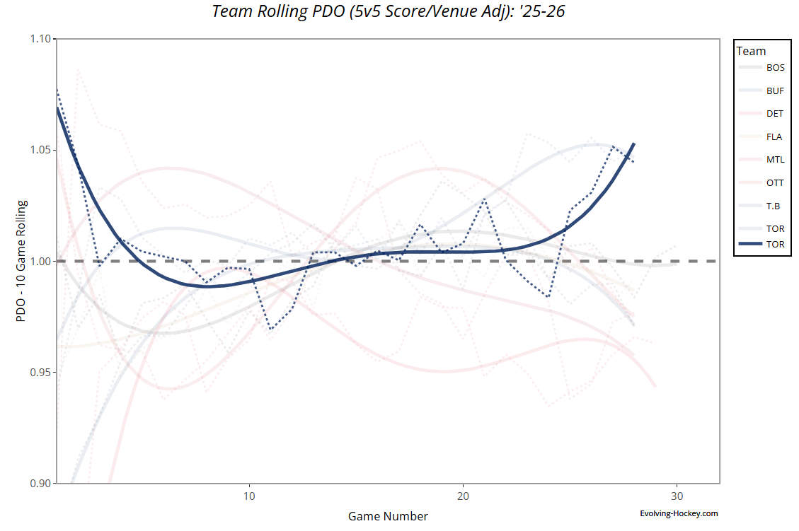 Caveat: Six games is an incredibly small sample size, but let’s look at some numbers. The Leafs (who have struggled with goaltending) lead the league in 5v5 team SV% in that six-game stretch (.960), and they’re second in shooting percentage with a 14.04 at 5v5. The screenshot above captures both stats combined into PDO over the course of their past 10 games. But what’s a little telling is that two of their recent wins were against the Florida Panthers and the Carolina Hurricanes.