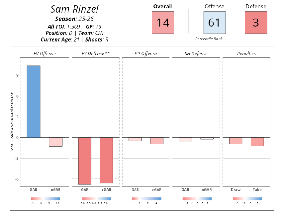 Let’s look at numbers real quick (5v5, of course). Rinzel had a goal differential rate (relative to teammate) of +.31/60. Not great, but third best among Hawk defensemen. Rinzel started 55.43% of his shifts in the offensive zone, according to Natural StatTrick. That’s third-highest on the team after Artyom Levshunov and Matt Grzelcyk. Rinzel had a 44.6% expected goals share (eighth best on the team), a 50.34% actual goals share (fifth best on the team), an expected goals against rate of 3.26/60 (fifth highest on the team), and an actual goals against rate of 3.14/60 (also fifth highest). Where he stacks in the league is in the third percentile in defense among defensemen (according to Evolving Hockey… and I hope this picture doesn’t load too big).